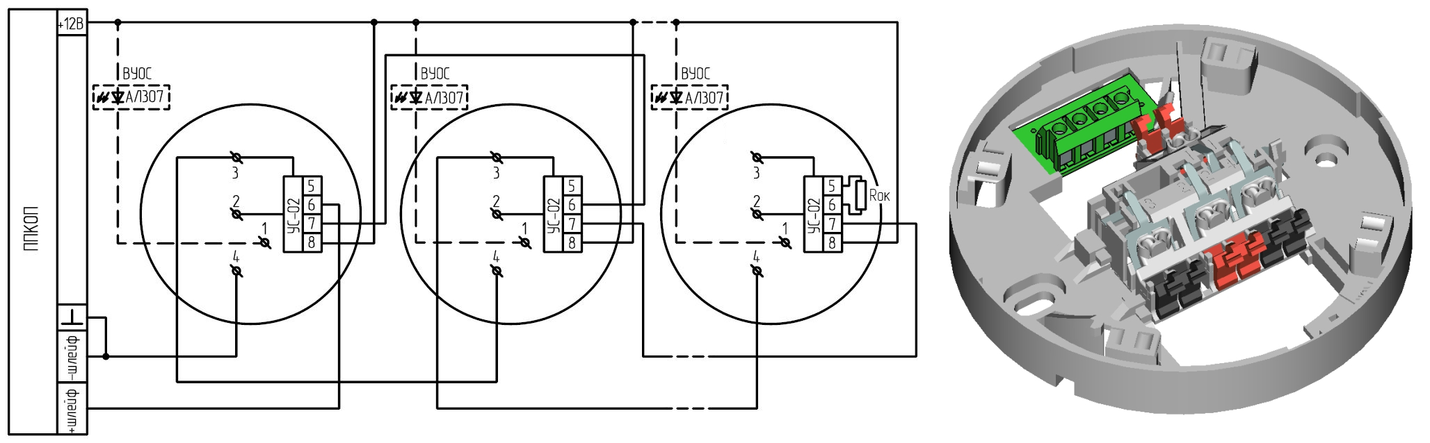 Соединение датчика с розеткой является разъемным. Круговые контакты позволяют устанавливать извещатель, не ориентируя его относительно розетки. Розетка является унифицированной и позволяет устанавливать любой извещатель тм Рубеж без перемонтажа системы. Подключение минусового провода ШС к контактам 3 и 4, короткозамкнутым через извещатель, позволяет получить сигнал «неисправность ШС» на ППКП при изъятии извещателя с розетки.