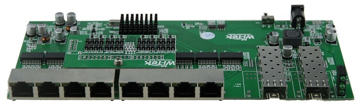 Коммутатор оснащен 7 портами 1000Base-T поддерживающих PoE In, 1 портом 1000Base-T поддерживающим Passive PoE Out и 2 портами SFP.